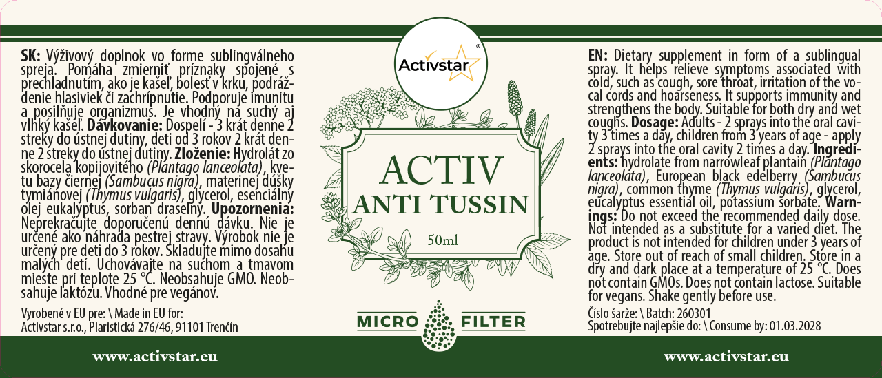 ACTIV ANTI TUSSIN je doplněk stravy ve formě sublingválního spreje, který pomáhá zmírnit nepříjemné příznaky spojené s nachlazením. Podporuje imunitu, zklidňuje podrážděné hrdlo a přispívá k celkové ochraně organismu.