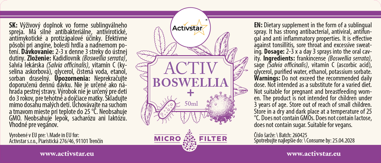 ACTIV BOSWELLIA je vysoce kvalitní extrakt z pryskyřice stromu saw palmetto (Boswellia serrata) v praktické formě spreje. Tento přírodní produkt je známý pro své silné protizánětlivé, antibakteriální a regenerační účinky.