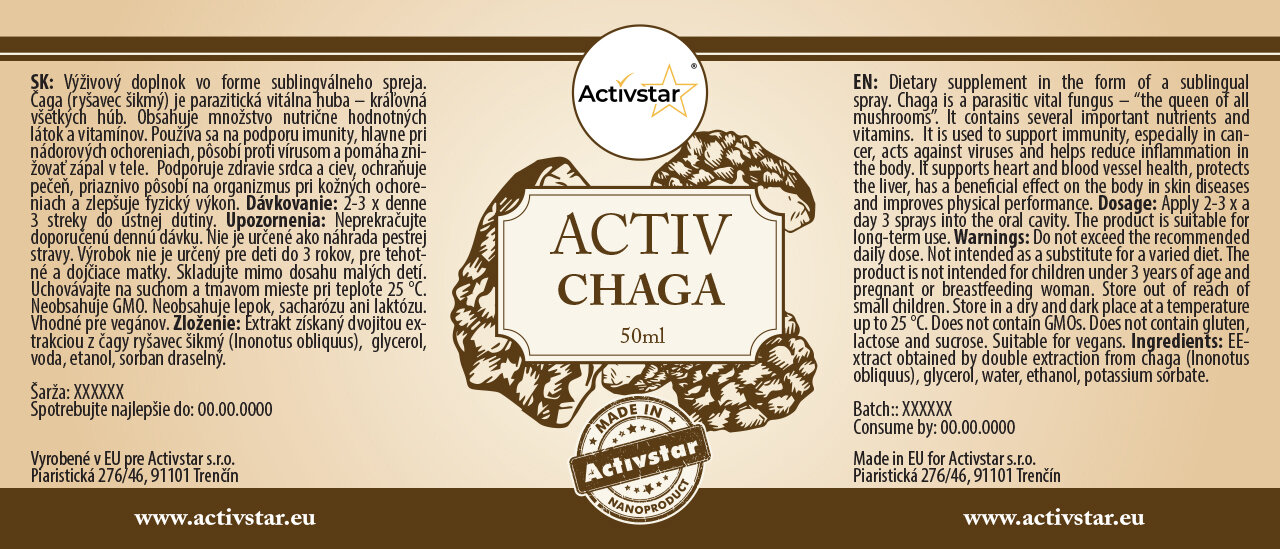 Doplněk stravy ve formě sublingválního spreje s extraktem z čagy (chaga), známé jako královna všech hub. Obsahuje řadu cenných živin a vitamínů.