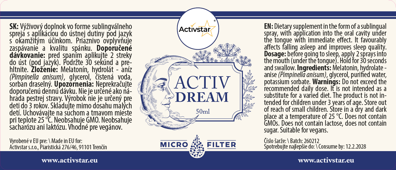 Activ Dream je doplněk stravy ve formě podjazykového spreje určený k podpoře usínání a kvality spánku. Pohodlná aplikace pod jazyk zajišťuje pohodlné užívání před spaním bez nutnosti polykání.