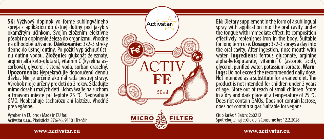 ACTIV FE je prémiový doplněk stravy ve formě sublingválního spreje, určený pro maximálně účinnou suplementaci železa. Při aplikaci pod jazyk se účinné látky okamžitě vstřebávají přímo do krevního oběhu, čímž se obchází trávicí trakt a zvyšuje se celková využitelnost přípravku.