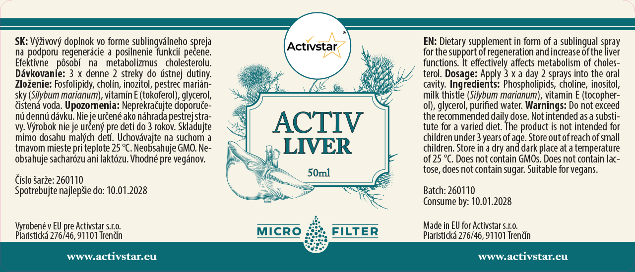 Dopřejte svým játrům potřebnou regeneraci a podporu - rychle, pohodlně a účinně s ACTIV LIVER sublingválním sprejem od společnosti Activstar. Tento výjimečný doplněk stravy podporuje správnou funkci jater a pomáhá při metabolismu cholesterolu.