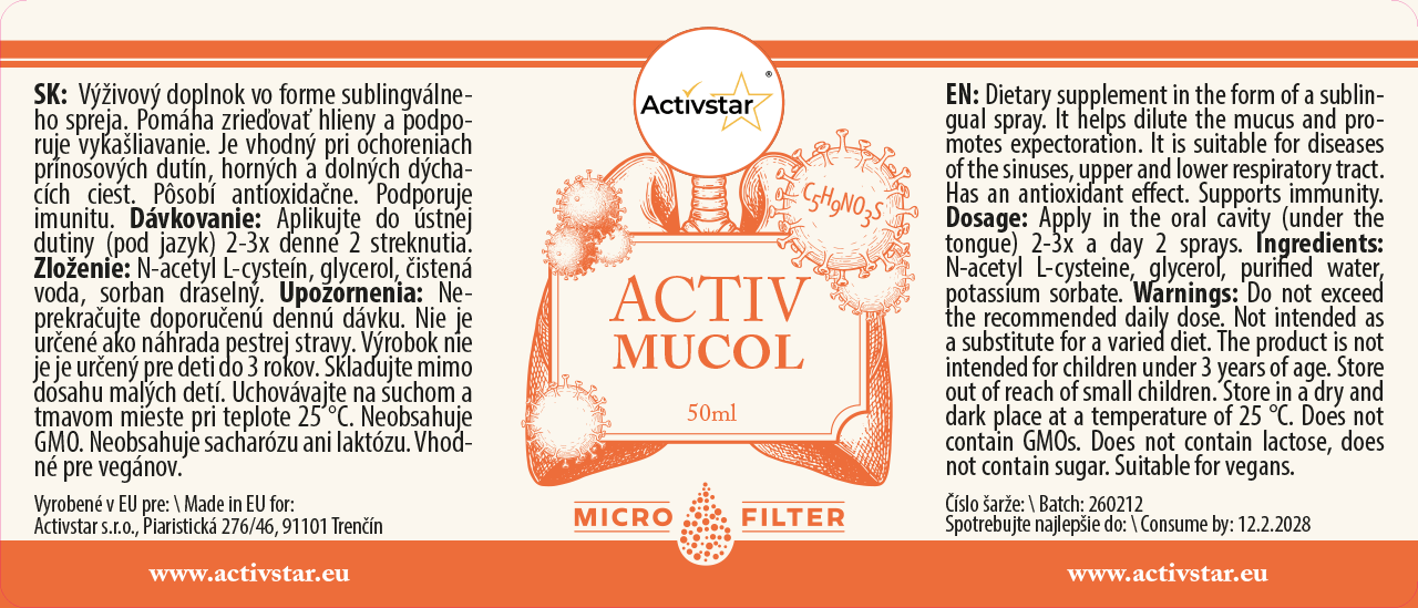 Activ Mucol je doplněk stravy ve formě podjazykového spreje, který pomáhá ředit hleny a podporuje vykašlávání. Je vhodný při potížích spojených s horními i dolními cestami dýchacími a pomáhá také podporovat imunitu.