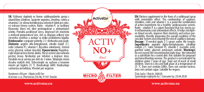 ACTIV NO+ je doplněk stravy ve formě sublingválního spreje s okamžitým účinkem. Kombinace argininu, citrulinu, rutinu a vitaminu C je mimořádně silnou kombinací účinných látek, které podporují zdraví cév, mikrocirkulaci a celkovou kondici kardiovaskulárního systému.