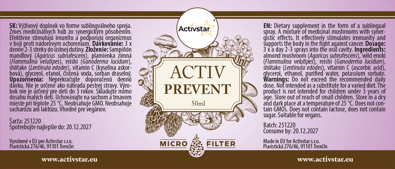ACTIV PREVENT je doplněk stravy ve formě podjazykového spreje, který kombinuje sílu léčivých hub se synergickým účinkem. Podporuje imunitní systém, vitalitu organismu a přispívá k ochraně buněk. Díky sublingválnímu podání se účinné látky rychle vstřebávají již v ústní dutině.