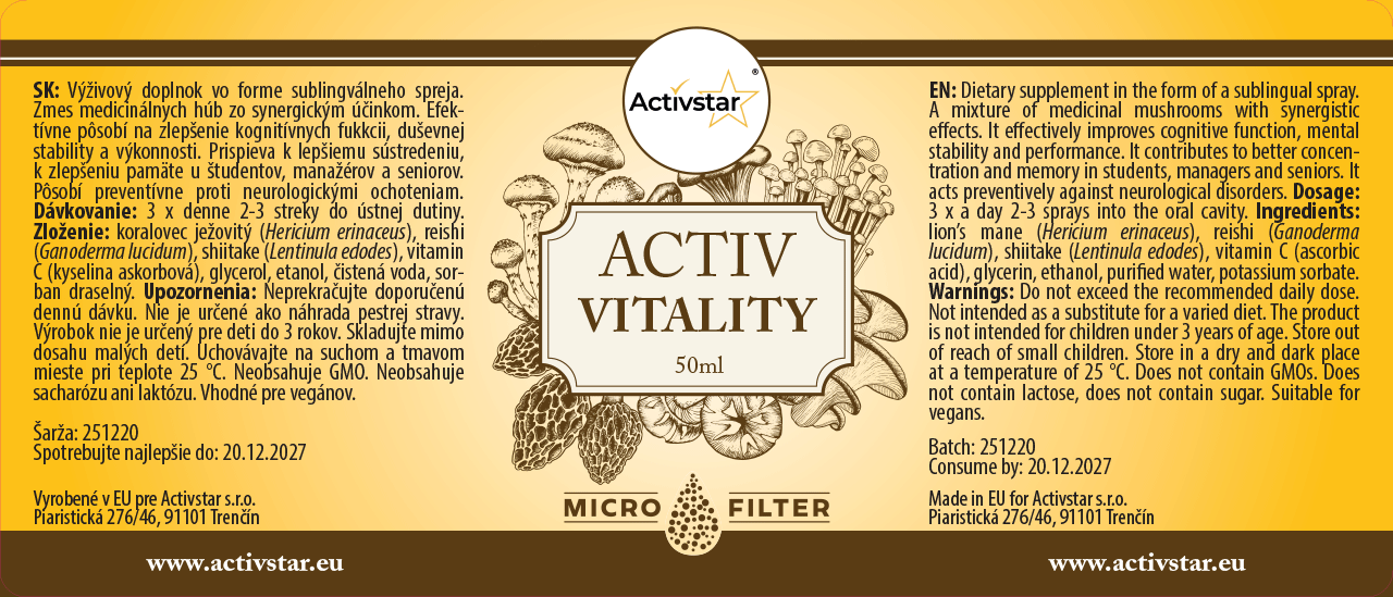 ACTIV VITALITY je doplněk stravy ve formě podjazykového spreje, který kombinuje sílu léčivých hub se synergickým účinkem. Podporuje kognitivní funkce, koncentraci, paměť a duševní výkonnost. Je ideální pro studenty, vedoucí pracovníky, seniory a všechny, kteří chtějí posílit duševní vitalitu a odolnost.