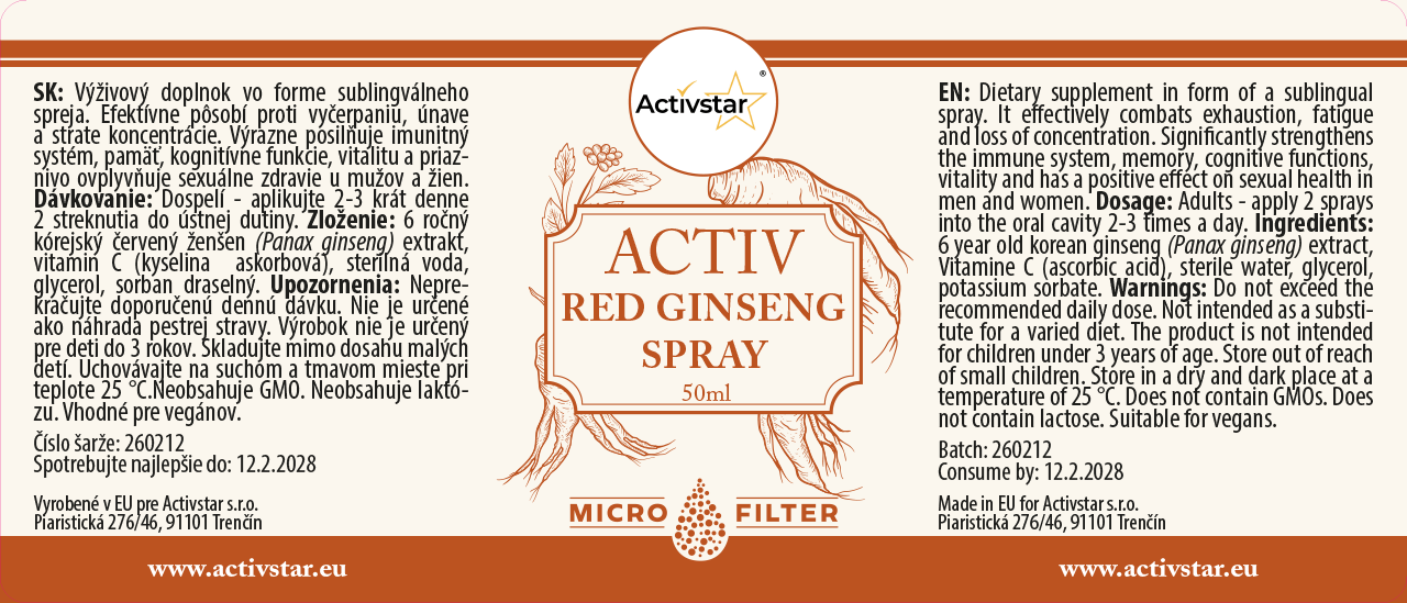 Activ Ginseng spray obsahuje 6letý korejský červený ženšen (Panax ginseng red), který je známý svými výjimečnými účinky na organismus.
