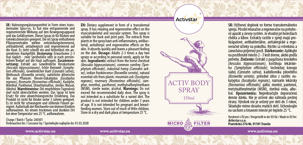 Activbody a Activkolagen spreje, jsou to pomocníci při Artróze, polyartroze, bolestech křížů, poškozených obratlů, kloubů prstů na rukou, křečových žilách, či malých popraskaných žilkách a trombóze. Tyto spreje stačí nastříkat na svá postižená místa, denně ai vícekrát je to možné a účinek se dostaví do 10 minut. Bolesti kloubů, protože jsem byla na vozíku, pak na berlích a dnes chodím sama po valstných, křečové žíly musela jsem nosit elastické podkolenky. Zánět kolena a tedy nákolenice, dnes je již zapomenuto. Konečně nebolí žíly, ty se krásně upravují nejsem taková černá na nohou a halvně nebolí, a víc už nevznikají černé fleky na nohou popraskané žíly, křečové žíly se netvoří. Operace se sice povedla, ale žíly se po pár měsících vrátily. Dnes už je to pro mě neakceptovatelná operace. Takže dnes už jen Activbody sprej a na klouby Activkolagen. Žádné podkolenky, žádné nakolenice a pásy na krizi. Děkuji Activstar